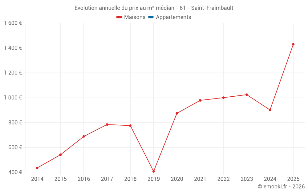 Le prix médian sur les 23 transactions de maisons des 24 derniers mois dans la commune de Saint-Fraimbault était de 905 € par mètre carré pour une valeur foncière médiane de 91 000 €. Sur cette période 60% des transactions se sont situées entre 600 et 1 415 € par mètre carré (du 2ème au 8ème déciles).