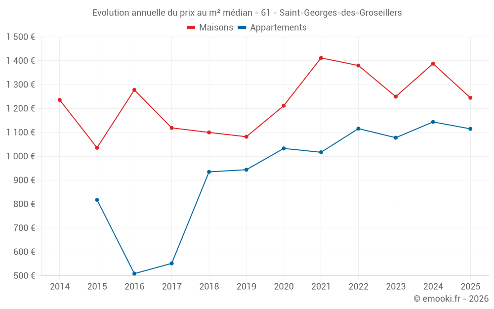 Le prix médian sur les 22 transactions d'appartements des 24 derniers mois dans la commune de Saint-Georges-des-Groseillers était de 1 126 € par mètre carré pour une valeur foncière médiane de 47 750 €. Sur cette période 60% des transactions se sont situées entre 1 000 et 1 241 € par mètre carré (du 2ème au 8ème déciles).