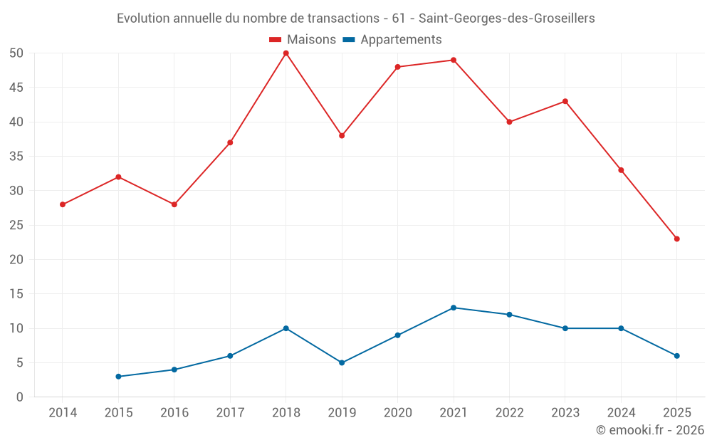 Le prix médian sur les 23 transactions de maisons des 6 derniers mois dans la commune de Saint-Georges-des-Groseillers était de 1 245 € par mètre carré pour une valeur foncière médiane de 114 000 €. Sur cette période 60% des transactions se sont situées entre 914 et 1 767 € par mètre carré (du 2ème au 8ème déciles).