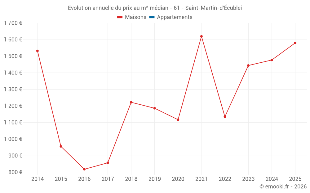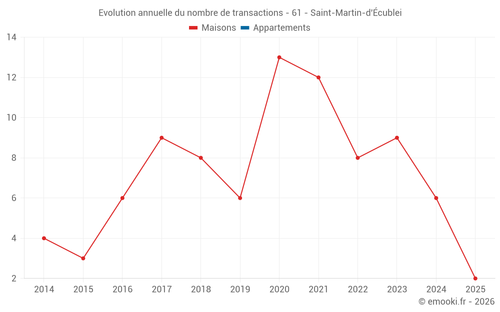 Le prix médian sur les 16 transactions de maisons des 24 derniers mois dans la commune de Saint-Martin-d'Écublei était de 1 490 € par mètre carré pour une valeur foncière médiane de 129 250 €. Sur cette période 60% des transactions se sont situées entre 1 096 et 1 796 € par mètre carré (du 2ème au 8ème déciles).