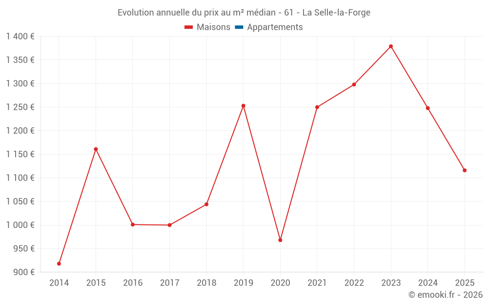 Le prix médian sur les 17 transactions de maisons des 12 derniers mois dans la commune de la Selle-la-Forge était de 1 212 € par mètre carré pour une valeur foncière médiane de 88 078 €. Sur cette période 60% des transactions se sont situées entre 661 et 1 767 € par mètre carré (du 2ème au 8ème déciles).