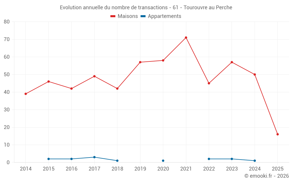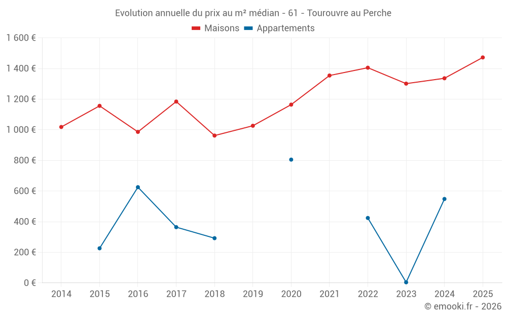 Le prix médian sur les 45 transactions de maisons des 12 derniers mois dans la commune de Tourouvre au Perche était de 1 486 € par mètre carré pour une valeur foncière médiane de 130 000 €. Sur cette période 60% des transactions se sont situées entre 1 055 et 2 076 € par mètre carré (du 2ème au 8ème déciles).