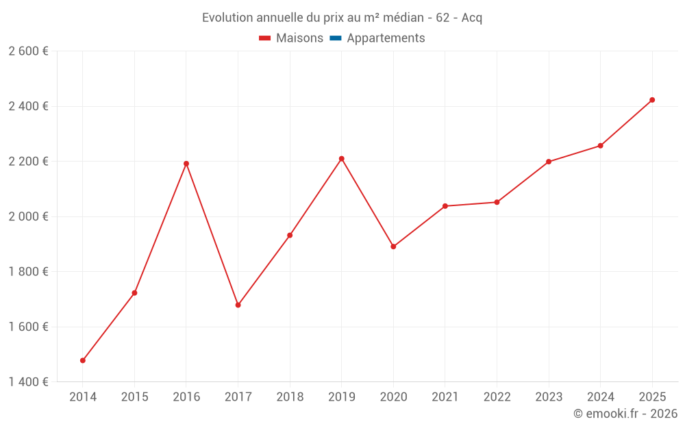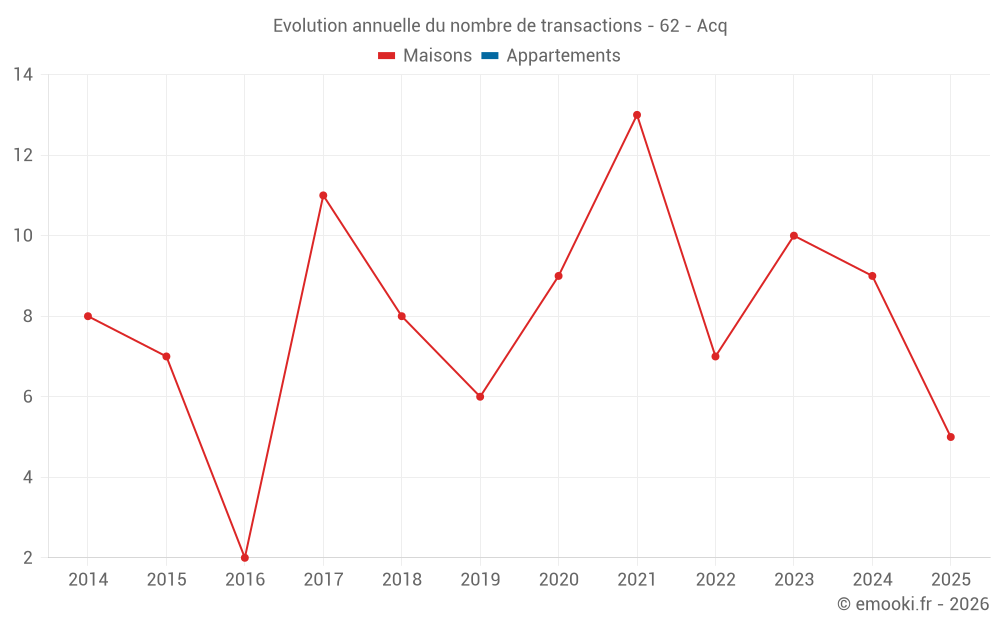 Le prix médian sur les 21 transactions de maisons des 24 derniers mois dans la commune d'Acq était de 2 257 € par mètre carré pour une valeur foncière médiane de 250 000 €. Sur cette période 60% des transactions se sont situées entre 1 540 et 2 620 € par mètre carré (du 2ème au 8ème déciles).