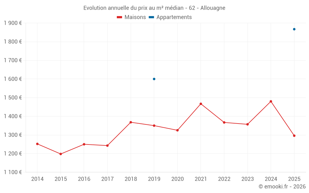 Le prix médian sur les 24 transactions de maisons des 12 derniers mois dans la commune d'Allouagne était de 1 397 € par mètre carré pour une valeur foncière médiane de 137 800 €. Sur cette période 60% des transactions se sont situées entre 942 et 2 026 € par mètre carré (du 2ème au 8ème déciles).