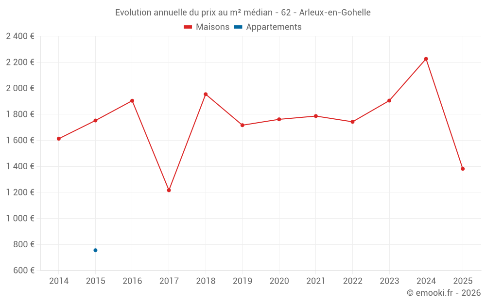 Le prix médian sur les 16 transactions de maisons des 24 derniers mois dans la commune d'Arleux-en-Gohelle était de 1 964 € par mètre carré pour une valeur foncière médiane de 214 300 €. Sur cette période 60% des transactions se sont situées entre 1 135 et 2 645 € par mètre carré (du 2ème au 8ème déciles).