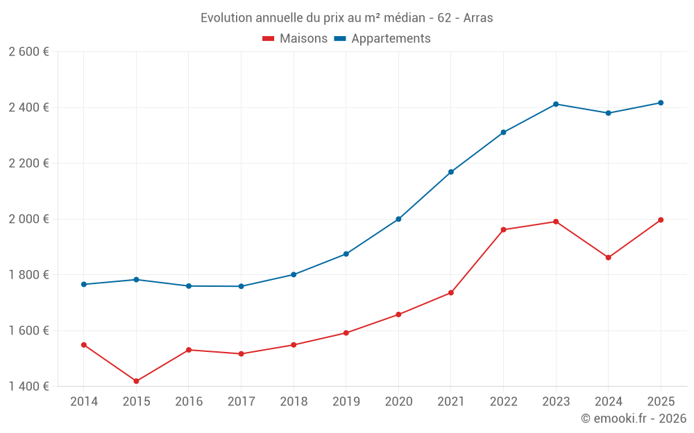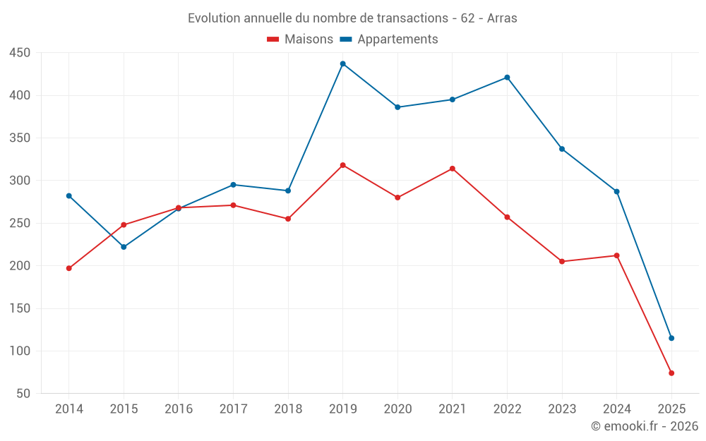 Le prix médian sur les 22 transactions de maisons des 3 derniers mois dans la commune d'Arras était de 1 882 € par mètre carré pour une valeur foncière médiane de 159 400 €. Sur cette période 60% des transactions se sont situées entre 1 611 et 2 307 € par mètre carré (du 2ème au 8ème déciles).