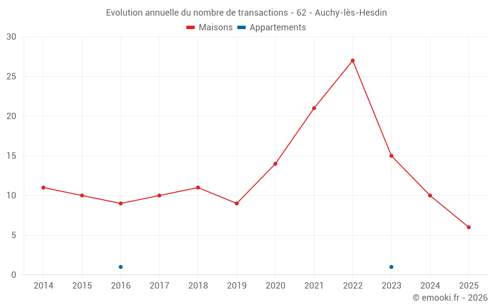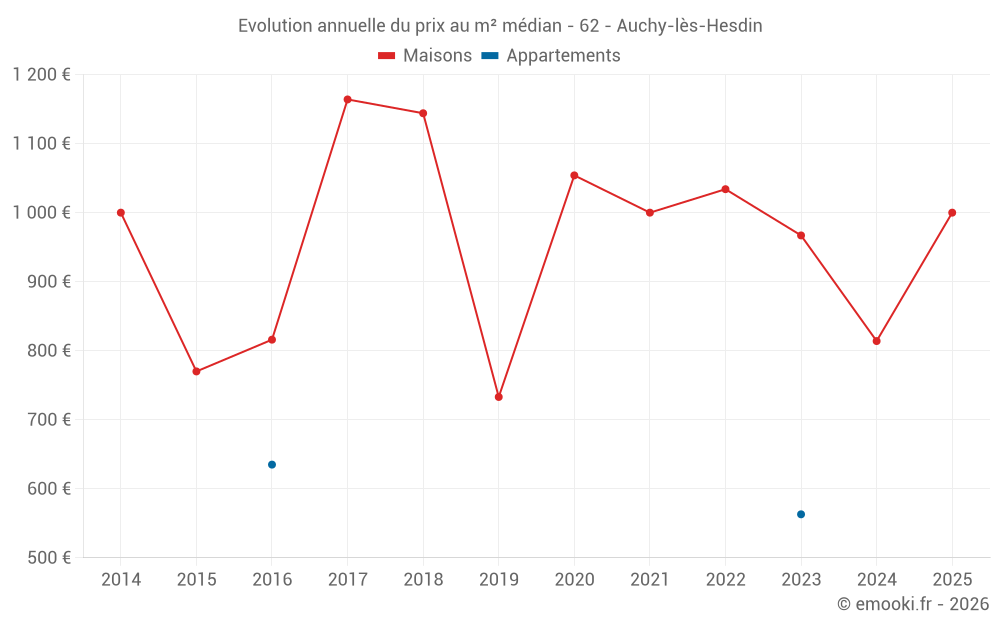 Le prix médian sur les 21 transactions de maisons des 24 derniers mois dans la commune d'Auchy-lès-Hesdin était de 967 € par mètre carré pour une valeur foncière médiane de 79 300 €. Sur cette période 60% des transactions se sont situées entre 647 et 1 250 € par mètre carré (du 2ème au 8ème déciles).
