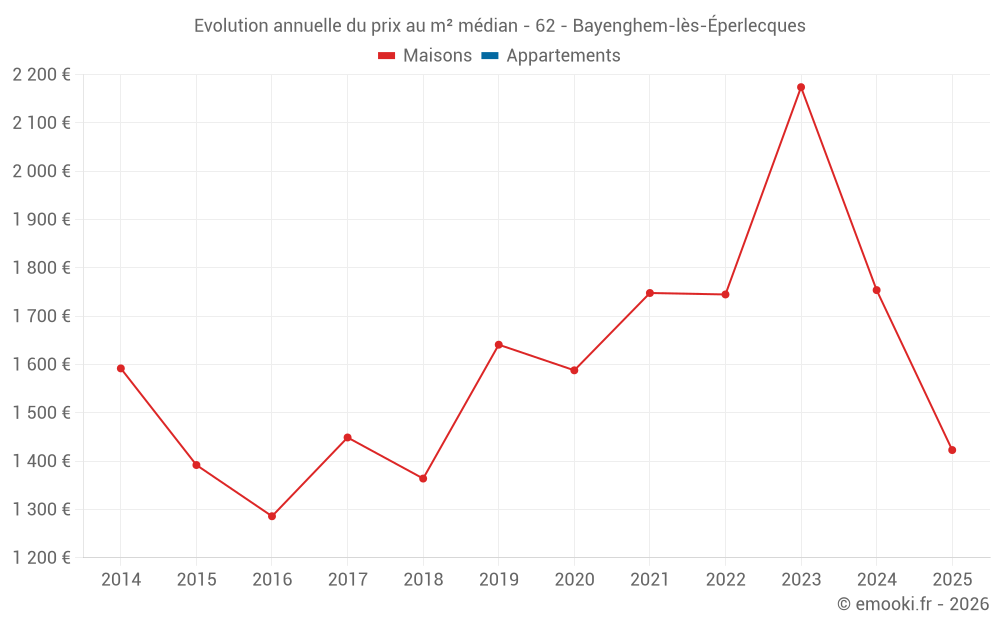 Le prix médian sur les 14 transactions de maisons des 24 derniers mois dans la commune de Bayenghem-lès-Éperlecques était de 1 934 € par mètre carré pour une valeur foncière médiane de 236 400 €. Sur cette période 60% des transactions se sont situées entre 1 649 et 2 150 € par mètre carré (du 2ème au 8ème déciles).