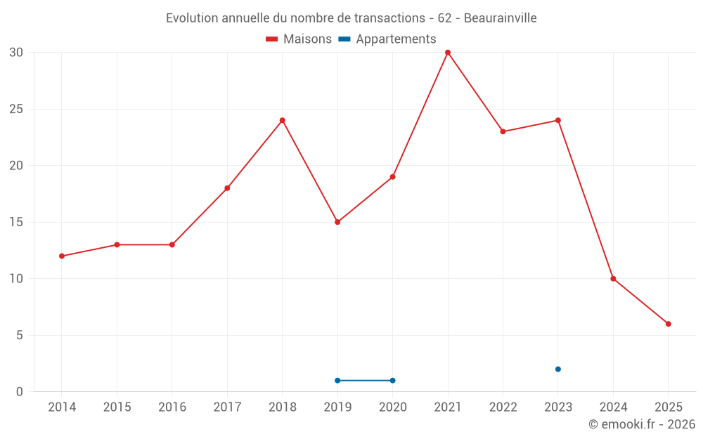 Le prix médian sur les 29 transactions de maisons des 24 derniers mois dans la commune de Beaurainville était de 1 774 € par mètre carré pour une valeur foncière médiane de 149 000 €. Sur cette période 60% des transactions se sont situées entre 1 086 et 2 059 € par mètre carré (du 2ème au 8ème déciles).