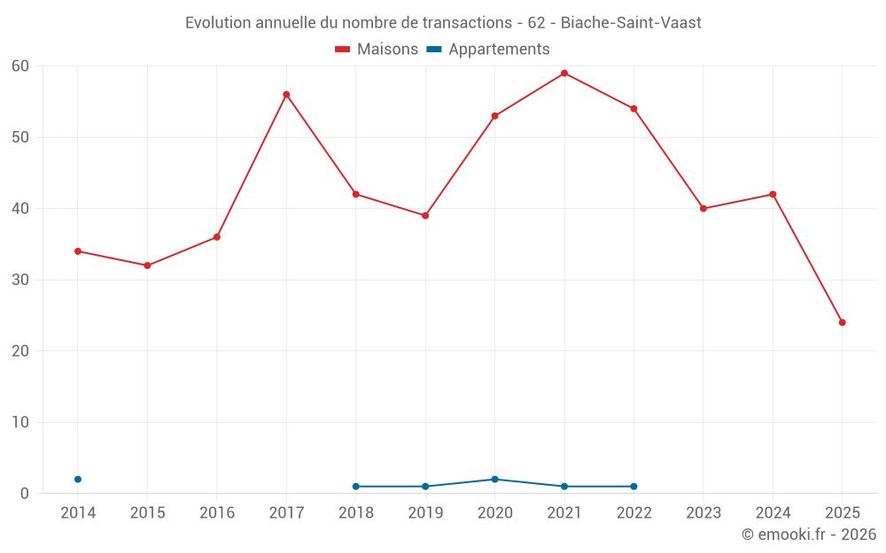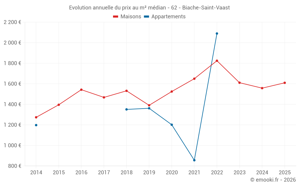 Le prix médian sur les 24 transactions de maisons des 6 derniers mois dans la commune de Biache-Saint-Vaast était de 1 610 € par mètre carré pour une valeur foncière médiane de 142 850 €. Sur cette période 60% des transactions se sont situées entre 1 256 et 2 274 € par mètre carré (du 2ème au 8ème déciles).