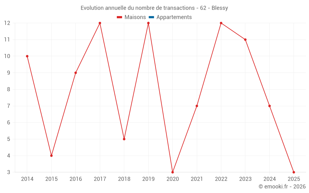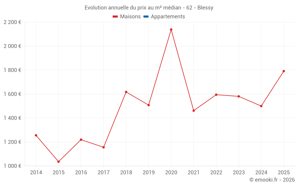 Le prix médian sur les 17 transactions de maisons des 24 derniers mois dans la commune de Blessy était de 1 505 € par mètre carré pour une valeur foncière médiane de 150 000 €. Sur cette période 60% des transactions se sont situées entre 1 229 et 1 856 € par mètre carré (du 2ème au 8ème déciles).
