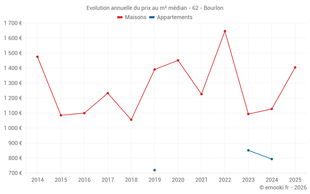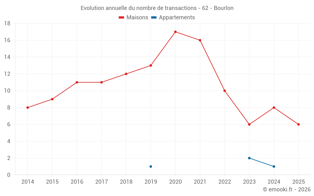 Le prix médian sur les 18 transactions de maisons des 24 derniers mois dans la commune de Bourlon était de 1 138 € par mètre carré pour une valeur foncière médiane de 117 000 €. Sur cette période 60% des transactions se sont situées entre 832 et 1 684 € par mètre carré (du 2ème au 8ème déciles).