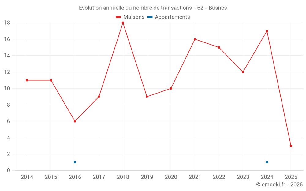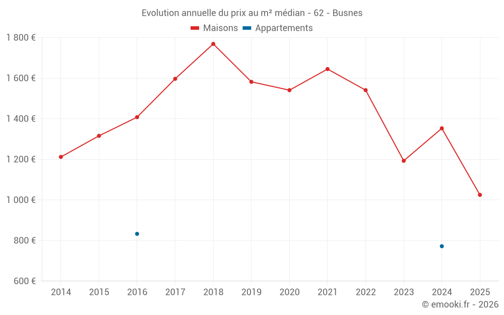 Le prix médian sur les 28 transactions de maisons des 24 derniers mois dans la commune de Busnes était de 1 230 € par mètre carré pour une valeur foncière médiane de 144 870 €. Sur cette période 60% des transactions se sont situées entre 776 et 1 963 € par mètre carré (du 2ème au 8ème déciles).