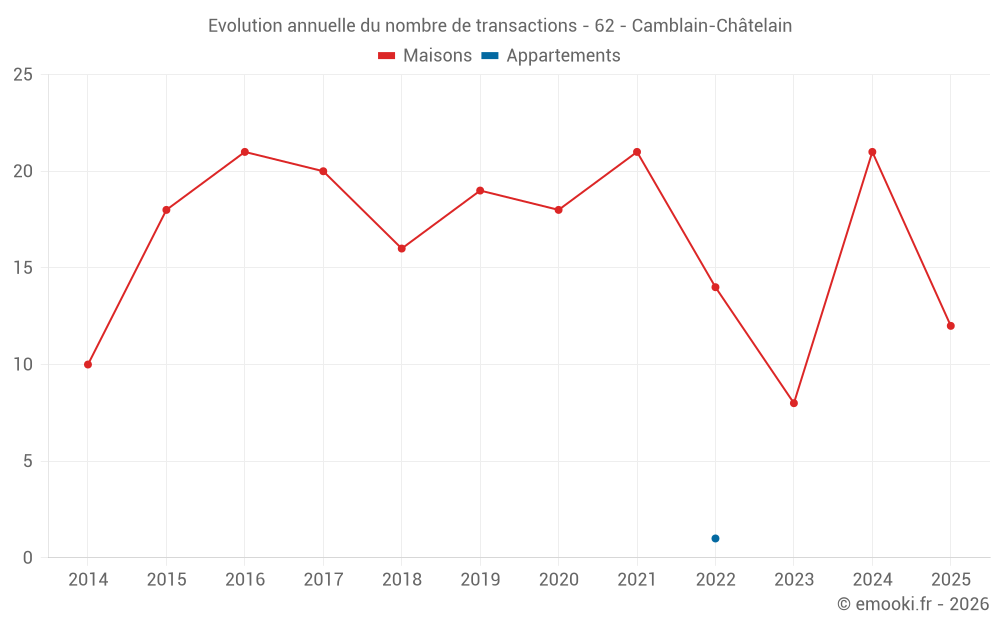 Le prix médian sur les 22 transactions de maisons des 12 derniers mois dans la commune de Camblain-Châtelain était de 1 412 € par mètre carré pour une valeur foncière médiane de 115 925 €. Sur cette période 60% des transactions se sont situées entre 919 et 1 750 € par mètre carré (du 2ème au 8ème déciles).