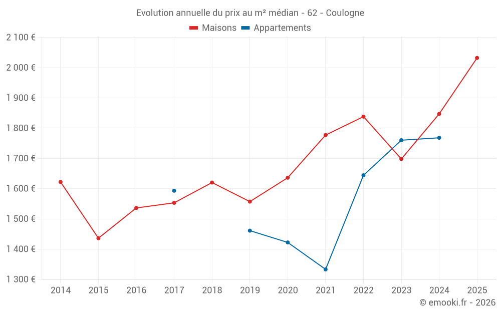 Le prix médian sur les 22 transactions de maisons des 6 derniers mois dans la commune de Coulogne était de 2 032 € par mètre carré pour une valeur foncière médiane de 167 750 €. Sur cette période 60% des transactions se sont situées entre 1 408 et 2 470 € par mètre carré (du 2ème au 8ème déciles).