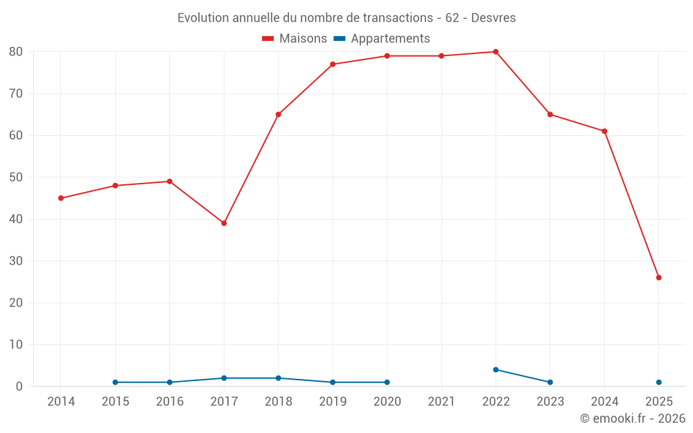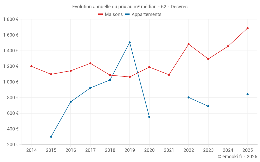 Le prix médian sur les 26 transactions de maisons des 6 derniers mois dans la commune de Desvres était de 1 687 € par mètre carré pour une valeur foncière médiane de 135 650 €. Sur cette période 60% des transactions se sont situées entre 1 273 et 1 938 € par mètre carré (du 2ème au 8ème déciles).