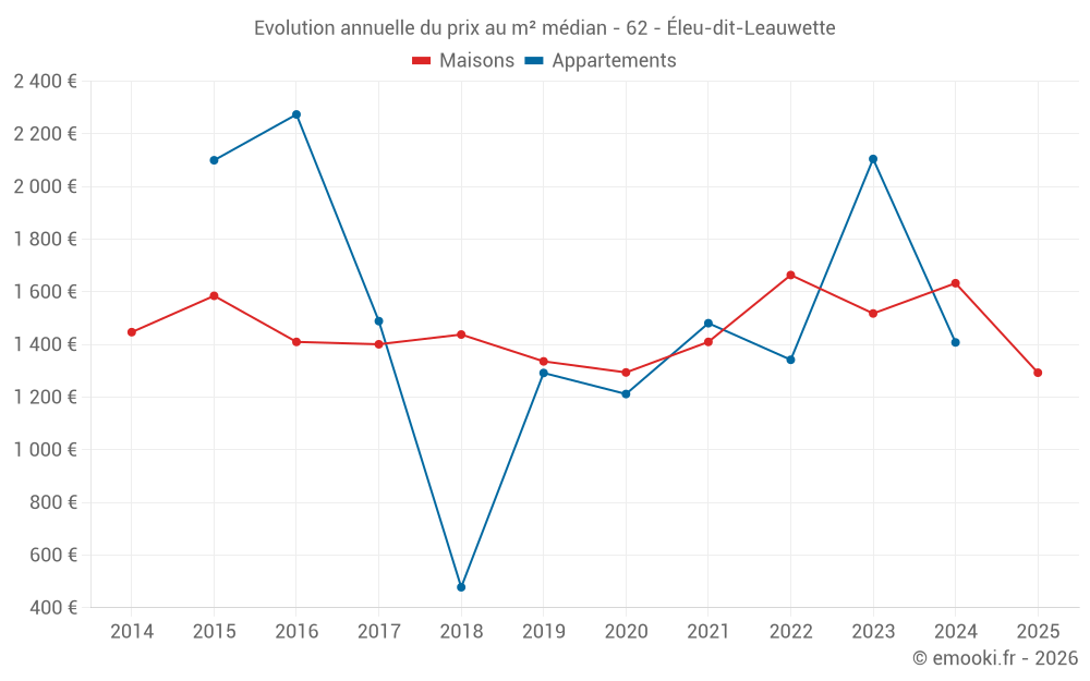 Le prix médian sur les 27 transactions de maisons des 12 derniers mois dans la commune d'Éleu-dit-Leauwette était de 1 557 € par mètre carré pour une valeur foncière médiane de 128 000 €. Sur cette période 60% des transactions se sont situées entre 1 002 et 2 048 € par mètre carré (du 2ème au 8ème déciles).
