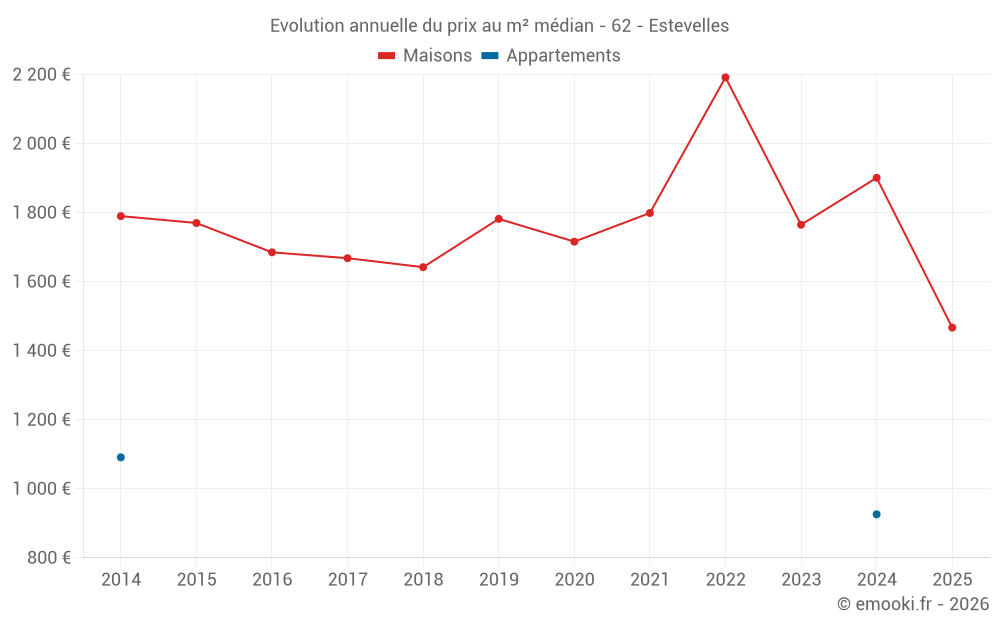 Le prix médian sur les 28 transactions de maisons des 24 derniers mois dans la commune d'Estevelles était de 1 748 € par mètre carré pour une valeur foncière médiane de 166 750 €. Sur cette période 60% des transactions se sont situées entre 1 133 et 2 238 € par mètre carré (du 2ème au 8ème déciles).
