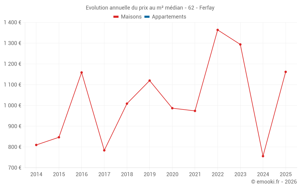 Le prix médian sur les 20 transactions de maisons des 24 derniers mois dans la commune de Ferfay était de 946 € par mètre carré pour une valeur foncière médiane de 94 042 €. Sur cette période 60% des transactions se sont situées entre 585 et 1 381 € par mètre carré (du 2ème au 8ème déciles).