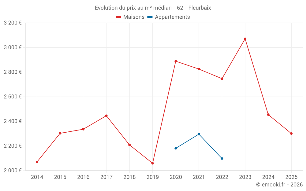 Le prix médian sur les 22 transactions de maisons des 12 derniers mois dans la commune de Fleurbaix était de 2 405 € par mètre carré pour une valeur foncière médiane de 348 900 €. Sur cette période 60% des transactions se sont situées entre 1 878 et 3 202 € par mètre carré (du 2ème au 8ème déciles).