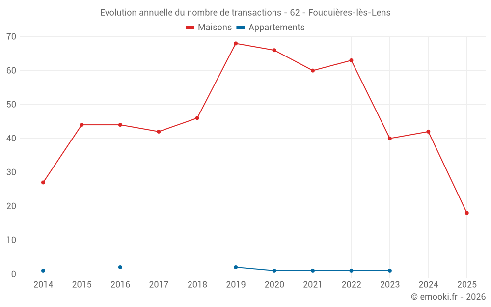 Le prix médian sur les 18 transactions de maisons des 6 derniers mois dans la commune de Fouquières-lès-Lens était de 1 166 € par mètre carré pour une valeur foncière médiane de 124 000 €. Sur cette période 60% des transactions se sont situées entre 1 005 et 1 886 € par mètre carré (du 2ème au 8ème déciles).