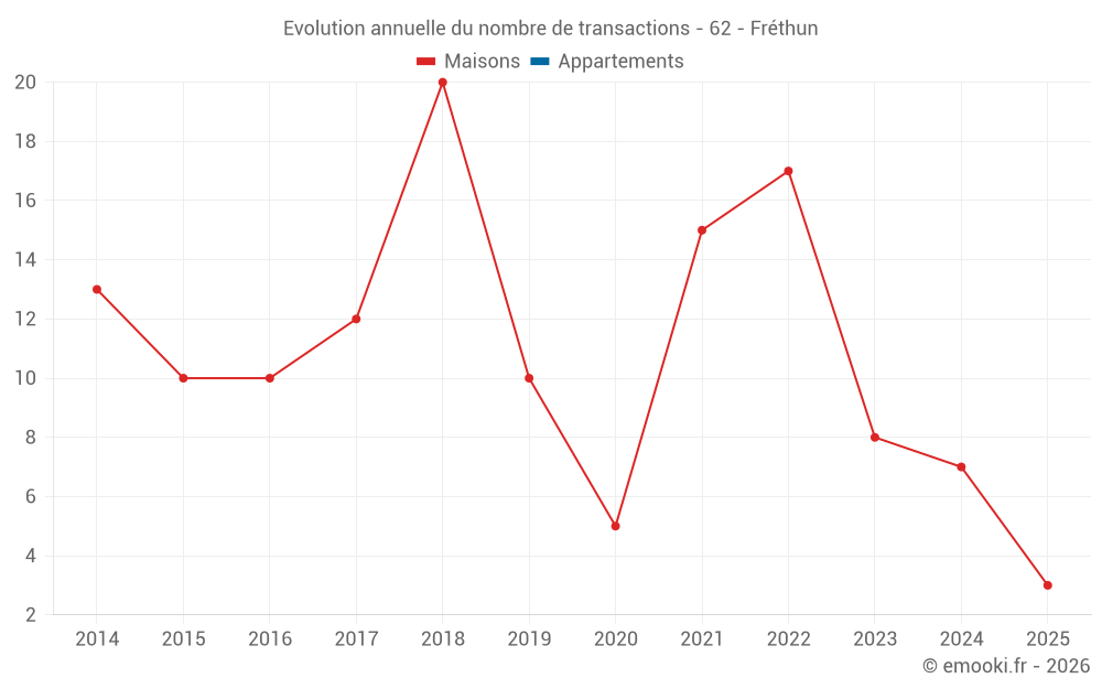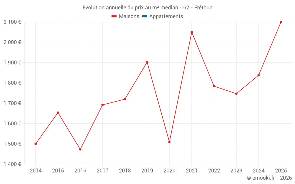 Le prix médian sur les 14 transactions de maisons des 24 derniers mois dans la commune de Fréthun était de 1 810 € par mètre carré pour une valeur foncière médiane de 181 768 €. Sur cette période 60% des transactions se sont situées entre 1 364 et 2 208 € par mètre carré (du 2ème au 8ème déciles).