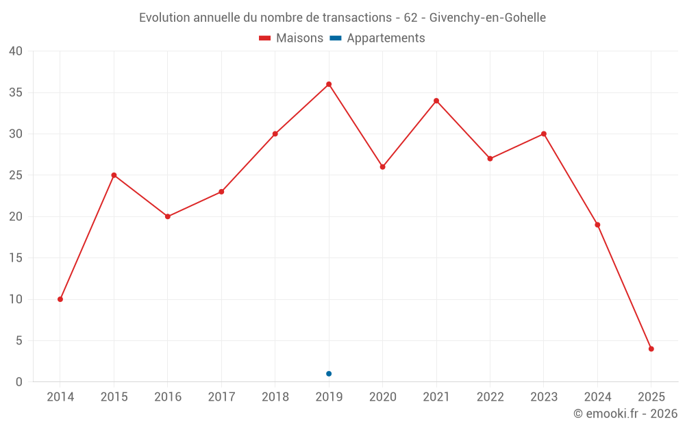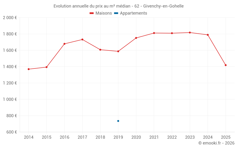 Le prix médian sur les 18 transactions de maisons des 12 derniers mois dans la commune de Givenchy-en-Gohelle était de 1 524 € par mètre carré pour une valeur foncière médiane de 152 500 €. Sur cette période 60% des transactions se sont situées entre 1 125 et 2 301 € par mètre carré (du 2ème au 8ème déciles).