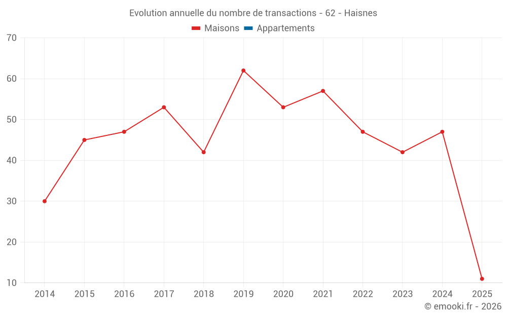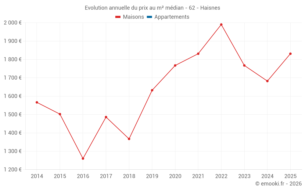 Le prix médian sur les 37 transactions de maisons des 12 derniers mois dans la commune d'Haisnes était de 1 831 € par mètre carré pour une valeur foncière médiane de 165 050 €. Sur cette période 60% des transactions se sont situées entre 1 305 et 2 325 € par mètre carré (du 2ème au 8ème déciles).