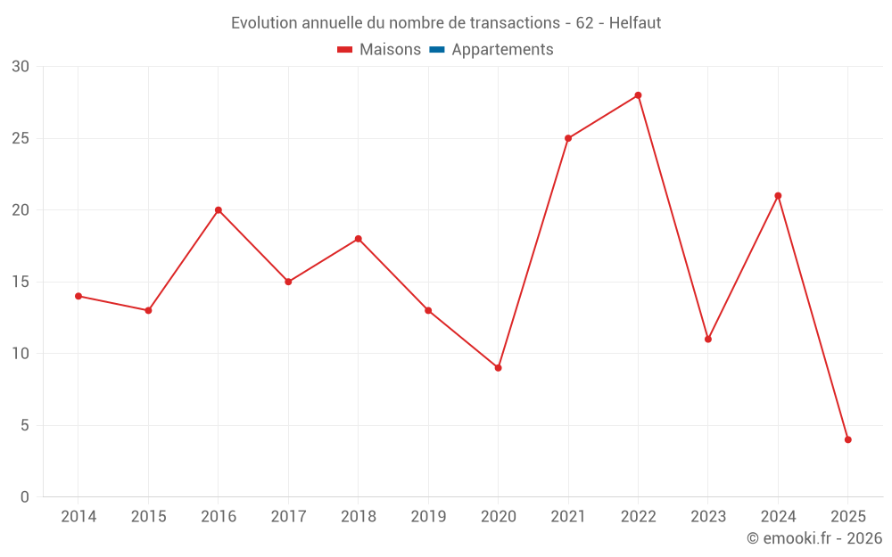 Le prix médian sur les 19 transactions de maisons des 12 derniers mois dans la commune d'Helfaut était de 1 543 € par mètre carré pour une valeur foncière médiane de 150 000 €. Sur cette période 60% des transactions se sont situées entre 1 285 et 2 119 € par mètre carré (du 2ème au 8ème déciles).