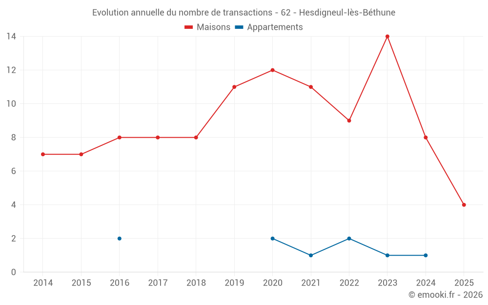 Le prix médian sur les 16 transactions de maisons des 24 derniers mois dans la commune d'Hesdigneul-lès-Béthune était de 1 650 € par mètre carré pour une valeur foncière médiane de 174 450 €. Sur cette période 60% des transactions se sont situées entre 966 et 1 912 € par mètre carré (du 2ème au 8ème déciles).