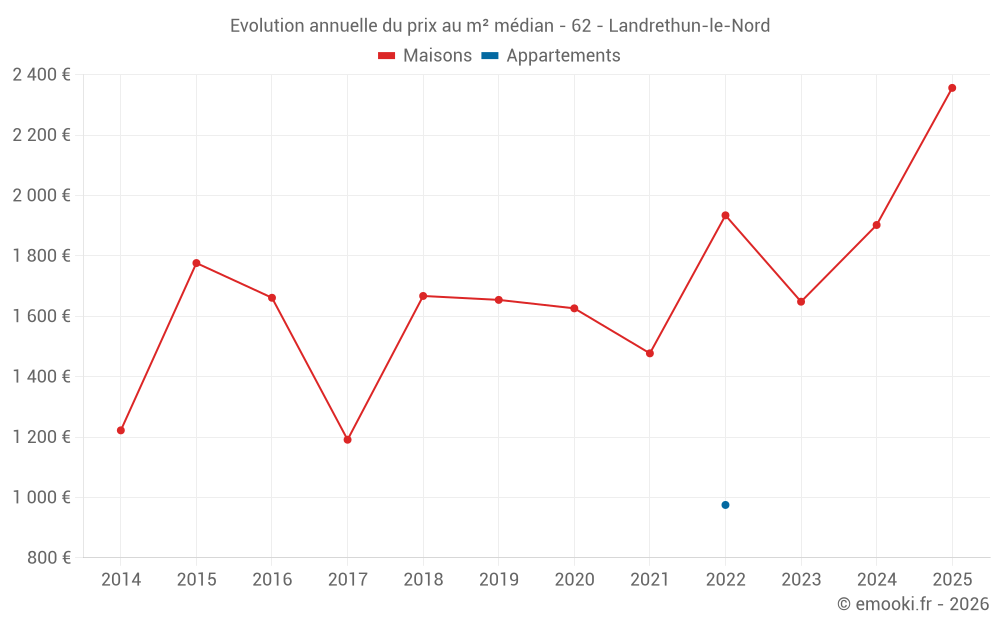 Le prix médian sur les 26 transactions de maisons des 24 derniers mois dans la commune de Landrethun-le-Nord était de 1 952 € par mètre carré pour une valeur foncière médiane de 180 900 €. Sur cette période 60% des transactions se sont situées entre 1 111 et 2 635 € par mètre carré (du 2ème au 8ème déciles).
