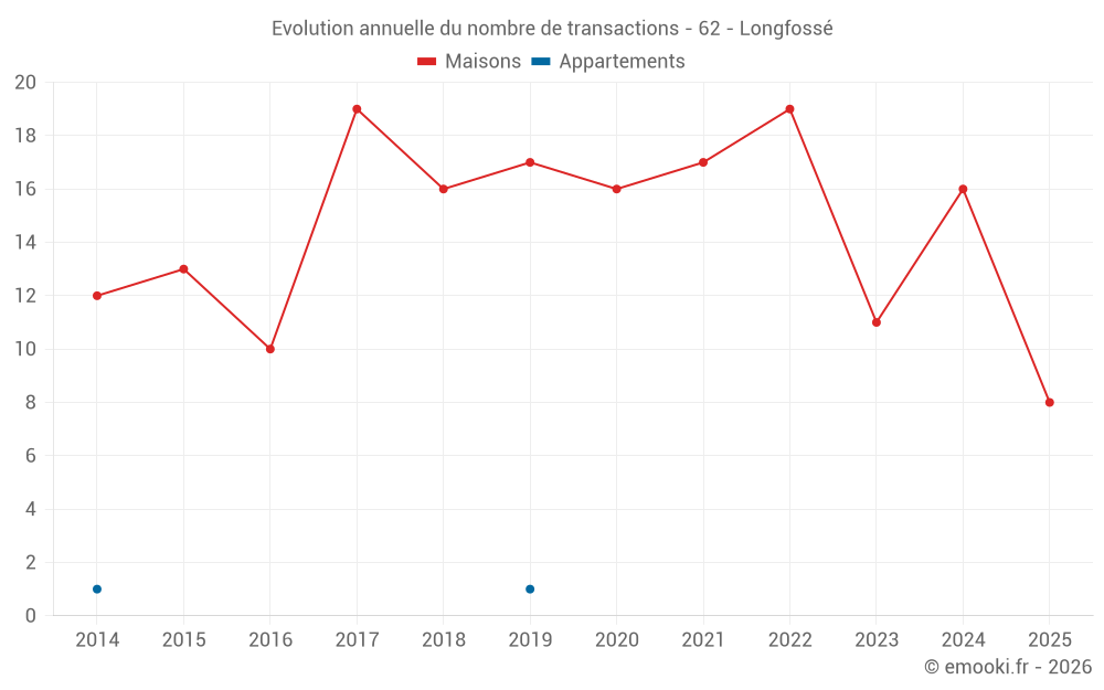Le prix médian sur les 17 transactions de maisons des 12 derniers mois dans la commune de Longfossé était de 1 571 € par mètre carré pour une valeur foncière médiane de 137 500 €. Sur cette période 60% des transactions se sont situées entre 1 132 et 2 136 € par mètre carré (du 2ème au 8ème déciles).