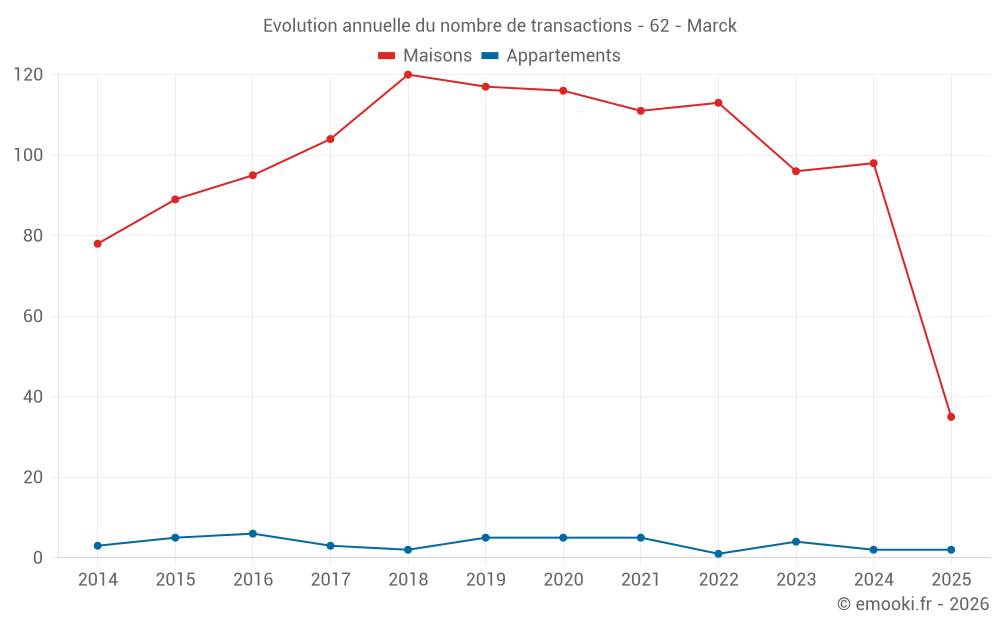 Le prix médian sur les 35 transactions de maisons des 6 derniers mois dans la commune de Marck était de 1 912 € par mètre carré pour une valeur foncière médiane de 195 500 €. Sur cette période 60% des transactions se sont situées entre 1 573 et 2 223 € par mètre carré (du 2ème au 8ème déciles).