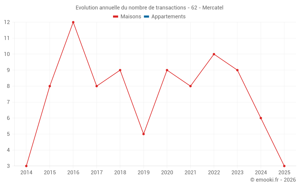 Le prix médian sur les 15 transactions de maisons des 24 derniers mois dans la commune de Mercatel était de 1 880 € par mètre carré pour une valeur foncière médiane de 219 500 €. Sur cette période 60% des transactions se sont situées entre 1 013 et 2 558 € par mètre carré (du 2ème au 8ème déciles).