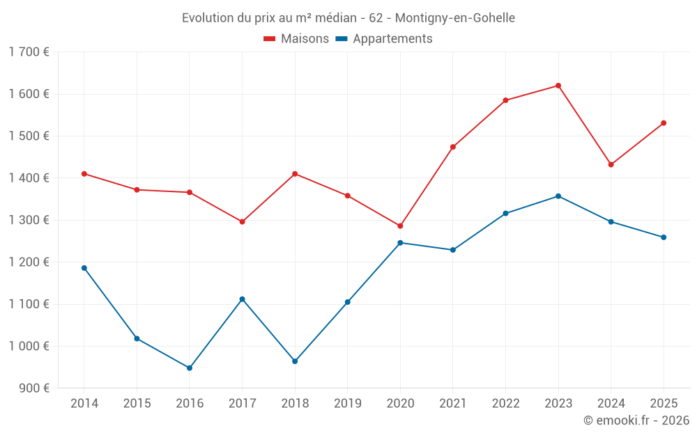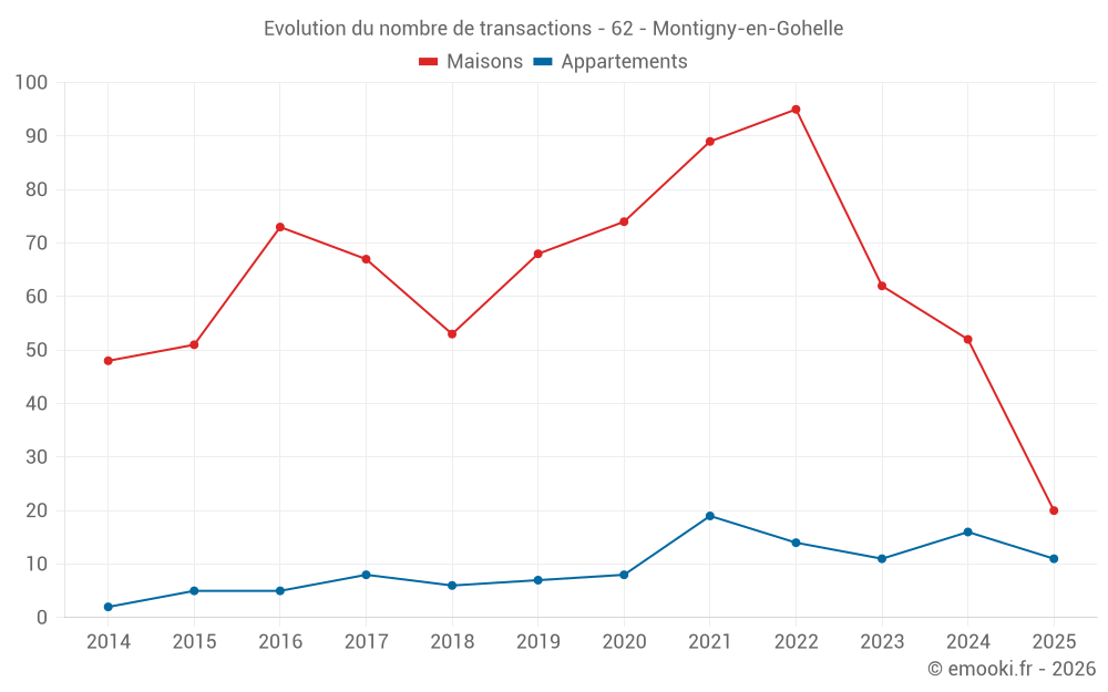 Le prix médian sur les 20 transactions de maisons des 6 derniers mois dans la commune de Montigny-en-Gohelle était de 1 531 € par mètre carré pour une valeur foncière médiane de 119 500 €. Sur cette période 60% des transactions se sont situées entre 1 145 et 1 706 € par mètre carré (du 2ème au 8ème déciles).