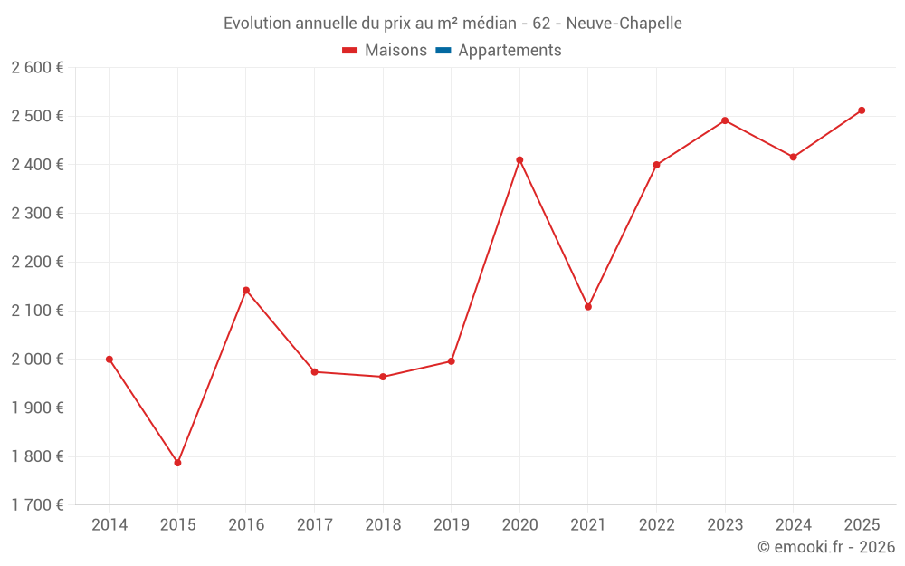 Le prix médian sur les 18 transactions de maisons des 24 derniers mois dans la commune de Neuve-Chapelle était de 2 464 € par mètre carré pour une valeur foncière médiane de 271 575 €. Sur cette période 60% des transactions se sont situées entre 2 018 et 2 950 € par mètre carré (du 2ème au 8ème déciles).
