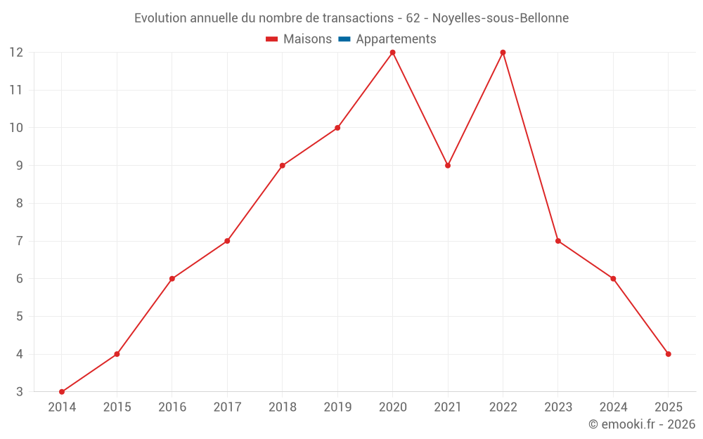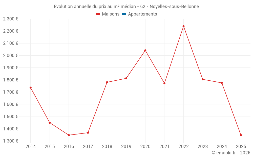 Le prix médian sur les 15 transactions de maisons des 24 derniers mois dans la commune de Noyelles-sous-Bellonne était de 1 554 € par mètre carré pour une valeur foncière médiane de 172 800 €. Sur cette période 60% des transactions se sont situées entre 1 292 et 2 461 € par mètre carré (du 2ème au 8ème déciles).