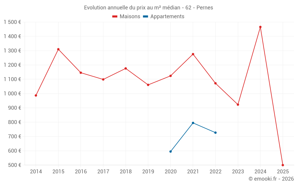 Le prix médian sur les 29 transactions de maisons des 24 derniers mois dans la commune de Pernes était de 1 179 € par mètre carré pour une valeur foncière médiane de 112 000 €. Sur cette période 60% des transactions se sont situées entre 833 et 1 738 € par mètre carré (du 2ème au 8ème déciles).
