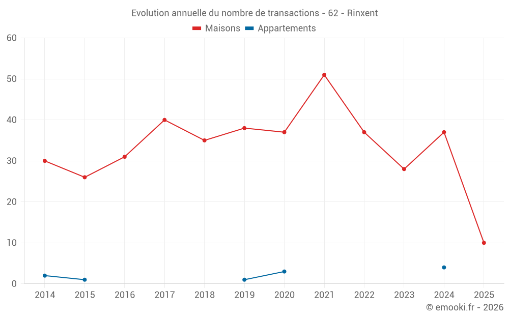 Le prix médian sur les 31 transactions de maisons des 12 derniers mois dans la commune de Rinxent était de 1 731 € par mètre carré pour une valeur foncière médiane de 165 000 €. Sur cette période 60% des transactions se sont situées entre 1 188 et 2 293 € par mètre carré (du 2ème au 8ème déciles).
