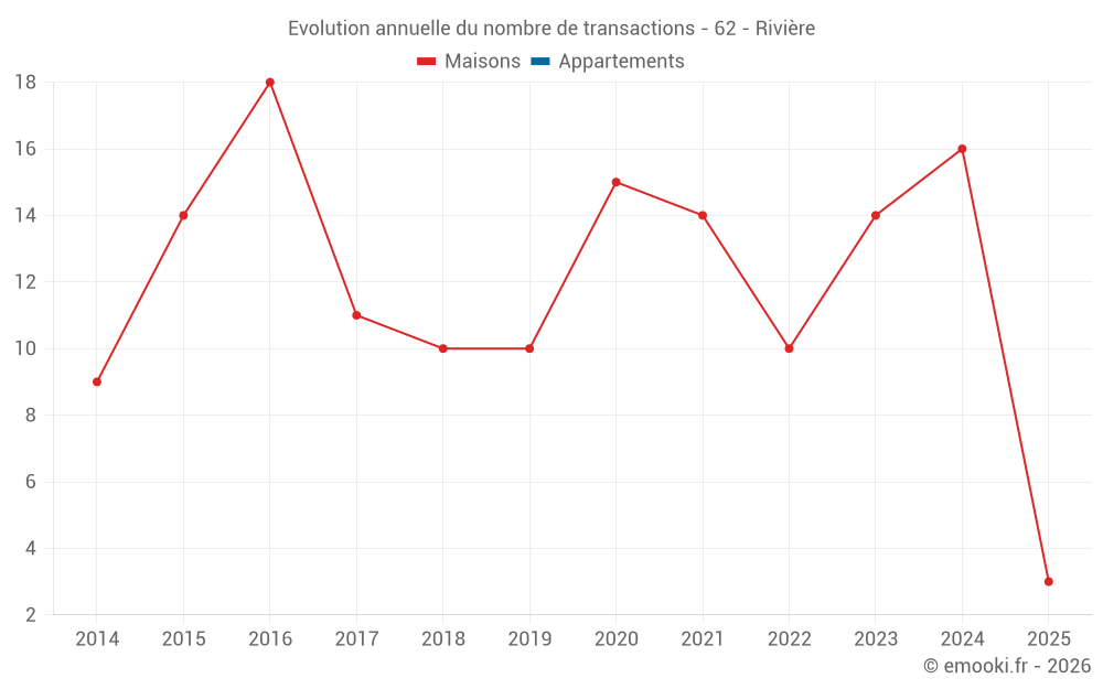 Le prix médian sur les 25 transactions de maisons des 24 derniers mois dans la commune de Rivière était de 1 791 € par mètre carré pour une valeur foncière médiane de 189 000 €. Sur cette période 60% des transactions se sont situées entre 1 387 et 2 114 € par mètre carré (du 2ème au 8ème déciles).