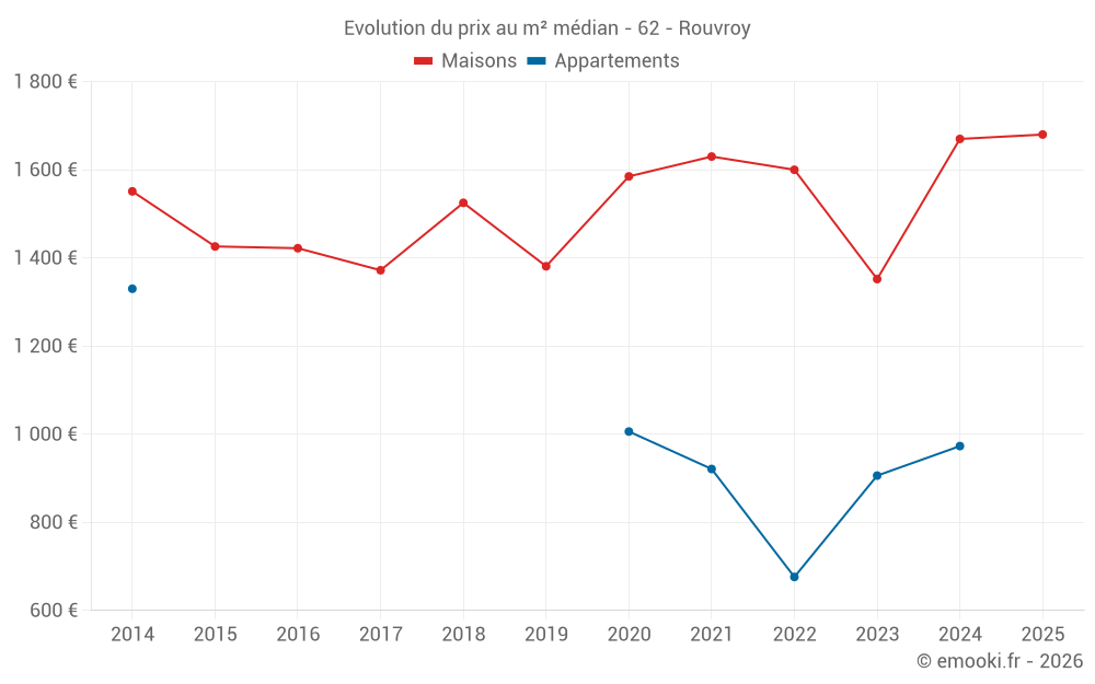 Le prix médian sur les 42 transactions de maisons des 12 derniers mois dans la commune de Rouvroy était de 1 736 € par mètre carré pour une valeur foncière médiane de 153 925 €. Sur cette période 60% des transactions se sont situées entre 1 345 et 2 274 € par mètre carré (du 2ème au 8ème déciles).