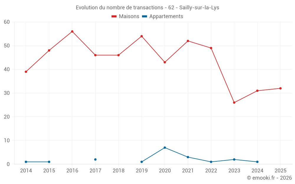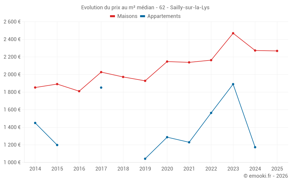 Le prix médian sur les 32 transactions de maisons des 6 derniers mois dans la commune de Sailly-sur-la-Lys était de 2 268 € par mètre carré pour une valeur foncière médiane de 229 500 €. Sur cette période 60% des transactions se sont situées entre 1 562 et 2 805 € par mètre carré (du 2ème au 8ème déciles).