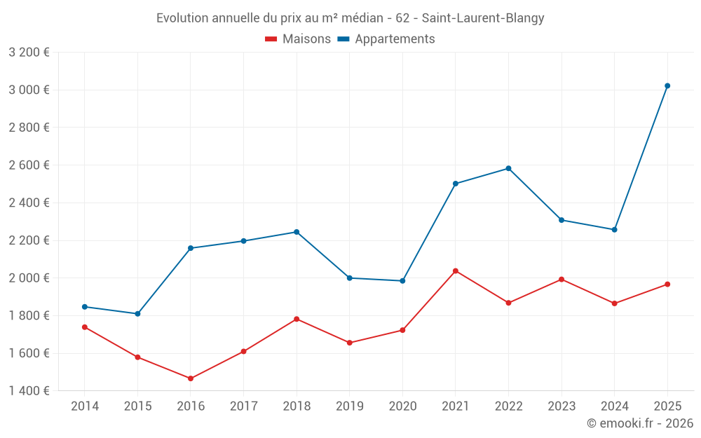 Le prix médian sur les 21 transactions d'appartements des 24 derniers mois dans la commune de Saint-Laurent-Blangy était de 2 677 € par mètre carré pour une valeur foncière médiane de 161 000 €. Sur cette période 60% des transactions se sont situées entre 1 685 et 3 104 € par mètre carré (du 2ème au 8ème déciles).