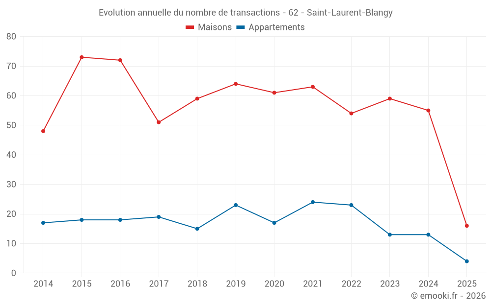 Le prix médian sur les 48 transactions de maisons des 12 derniers mois dans la commune de Saint-Laurent-Blangy était de 1 943 € par mètre carré pour une valeur foncière médiane de 168 850 €. Sur cette période 60% des transactions se sont situées entre 1 556 et 2 356 € par mètre carré (du 2ème au 8ème déciles).
