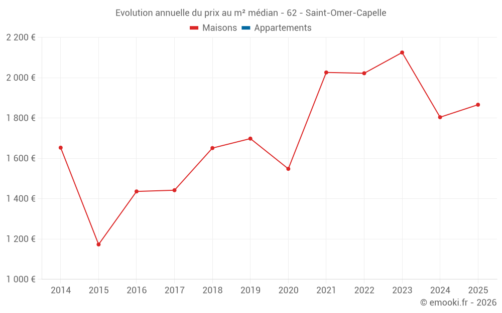 Le prix médian sur les 14 transactions de maisons des 24 derniers mois dans la commune de Saint-Omer-Capelle était de 1 956 € par mètre carré pour une valeur foncière médiane de 198 500 €. Sur cette période 60% des transactions se sont situées entre 1 609 et 2 199 € par mètre carré (du 2ème au 8ème déciles).