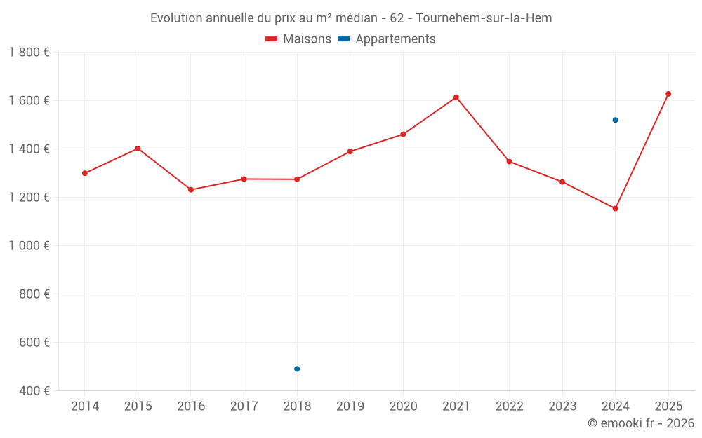 Le prix médian sur les 20 transactions de maisons des 24 derniers mois dans la commune de Tournehem-sur-la-Hem était de 1 172 € par mètre carré pour une valeur foncière médiane de 167 875 €. Sur cette période 60% des transactions se sont situées entre 918 et 1 740 € par mètre carré (du 2ème au 8ème déciles).