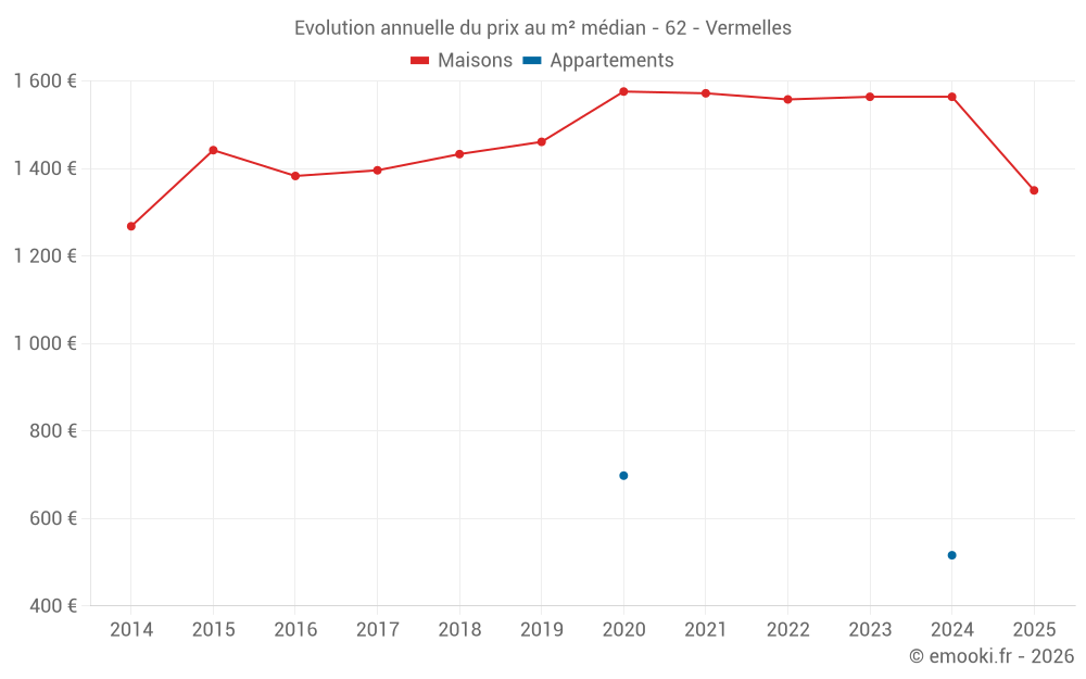 Le prix médian sur les 44 transactions de maisons des 12 derniers mois dans la commune de Vermelles était de 1 504 € par mètre carré pour une valeur foncière médiane de 127 450 €. Sur cette période 60% des transactions se sont situées entre 1 203 et 1 987 € par mètre carré (du 2ème au 8ème déciles).