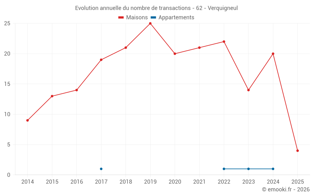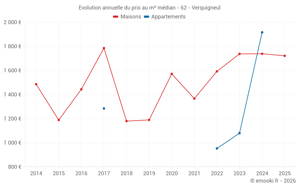 Le prix médian sur les 31 transactions de maisons des 24 derniers mois dans la commune de Verquigneul était de 1 740 € par mètre carré pour une valeur foncière médiane de 163 600 €. Sur cette période 60% des transactions se sont situées entre 942 et 2 177 € par mètre carré (du 2ème au 8ème déciles).