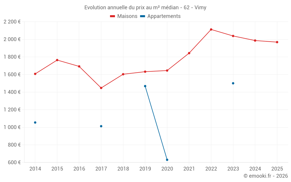 Le prix médian sur les 39 transactions de maisons des 12 derniers mois dans la commune de Vimy était de 1 968 € par mètre carré pour une valeur foncière médiane de 170 000 €. Sur cette période 60% des transactions se sont situées entre 1 427 et 2 402 € par mètre carré (du 2ème au 8ème déciles).