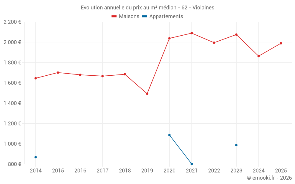 Le prix médian sur les 22 transactions de maisons des 12 derniers mois dans la commune de Violaines était de 1 916 € par mètre carré pour une valeur foncière médiane de 194 260 €. Sur cette période 60% des transactions se sont situées entre 1 491 et 2 332 € par mètre carré (du 2ème au 8ème déciles).